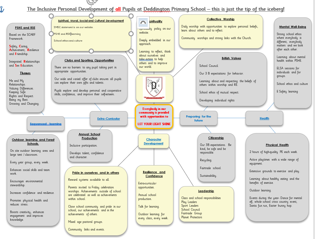 At Deddington Primary School, the personal development of pupils is addressed through formal, sequenced learning opportunities and informally through a happy and nurturing close school community. Spirituality and our strong Christian ethos. The aim of personal development at Deddington Primary Schools is to help children grow into confident, healthy, responsible, and well-rounded individuals. It goes beyond academic learning to focus on the social, emotional, moral, and physical aspects of a child’s growth.